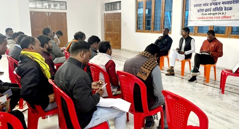 नर्मदापुरम / आज हमारा गांव संगठन मध्यप्रदेश की प्रदेशकार्य समिति की बैठक नर्मदापुरम के केसला ब्लॉक के गुरूकृपा रिसोर्ट में संपन हुआ । जिसमें प्रदेश संयोजक दुर्गेश धुर्वे ने संगठन का विस्तार करते हुए राघवेंद्र भलावी छिन्दवाड़ा को प्रदेश सचिव बनाया, साथ ही रंजीत सर्राटी अनूपपुर को प्रदेश खेल प्रमुख नियुक्त किया गया। प्रदेश संयोजक दुर्गेश धुर्वे ने कहा कि प्रदेश में हो रहे आदिवासियो पर अत्याचार के ख़िलाफ़ आवाज मज़बूत करने के लिए प्रतिबद्ध है शासन प्रशासन की लापरवाही को बर्दास्त नहीं किया जाएगा प्रदेश अध्यक्ष जितेन्द्र सिंह मरकाम ने कहा ज़िला उमरिया में प्रधानमंत्री आवास घोटाला करने वाले कर्मचारियों पर FIR के बावजूद गिरफ़्तारी नहीं किया और ना ही उन्हें बर्खास्त किया गया। यदि जल्द से जल्द कार्यवाही नहीं हुआ तो हमारा गाँव संगठन संपूर्ण मध्यप्रदेश में आंदोलन किया जायेगा । प्रदेश संस्कृति प्रमुख शिवकुमार कुंजाम ने कहा आदिवासियो की संस्कृति ख़तरे में जिसको बचाने के संगठन प्रदेश भर में सांस्कृतिक प्रतियोगिता आयोजित करके आदिवासी संस्कृति बचाने का काम करेंगे। बैठक में हमारा गांव संगठन के संस्थापक सदस्य रवि , संगठन के प्रदेश संयोजक दुर्गेश धुर्वे, प्रदेश अध्यक्ष जितेन्द्र सिंह मरकाम, प्रदेश सचिव राघवेंद्र भलावी , कार्यकारी अध्यक्ष उजियार सिंह धुर्वे , संस्कृति प्रमुख शिवकुमार कुंजाम, योजना प्रमुख मूलाजी नर्रे सहित उमरिया, मण्डला, शहडोल, सीधी, बैतूल, छिन्दवाड़ा, डिंडोरी, पांडुरना, अनूपपुर, सहित एक दर्जन से अधिक ज़िले के हमारा गांव संगठन के पदाधिकारी उपस्थित रहे।