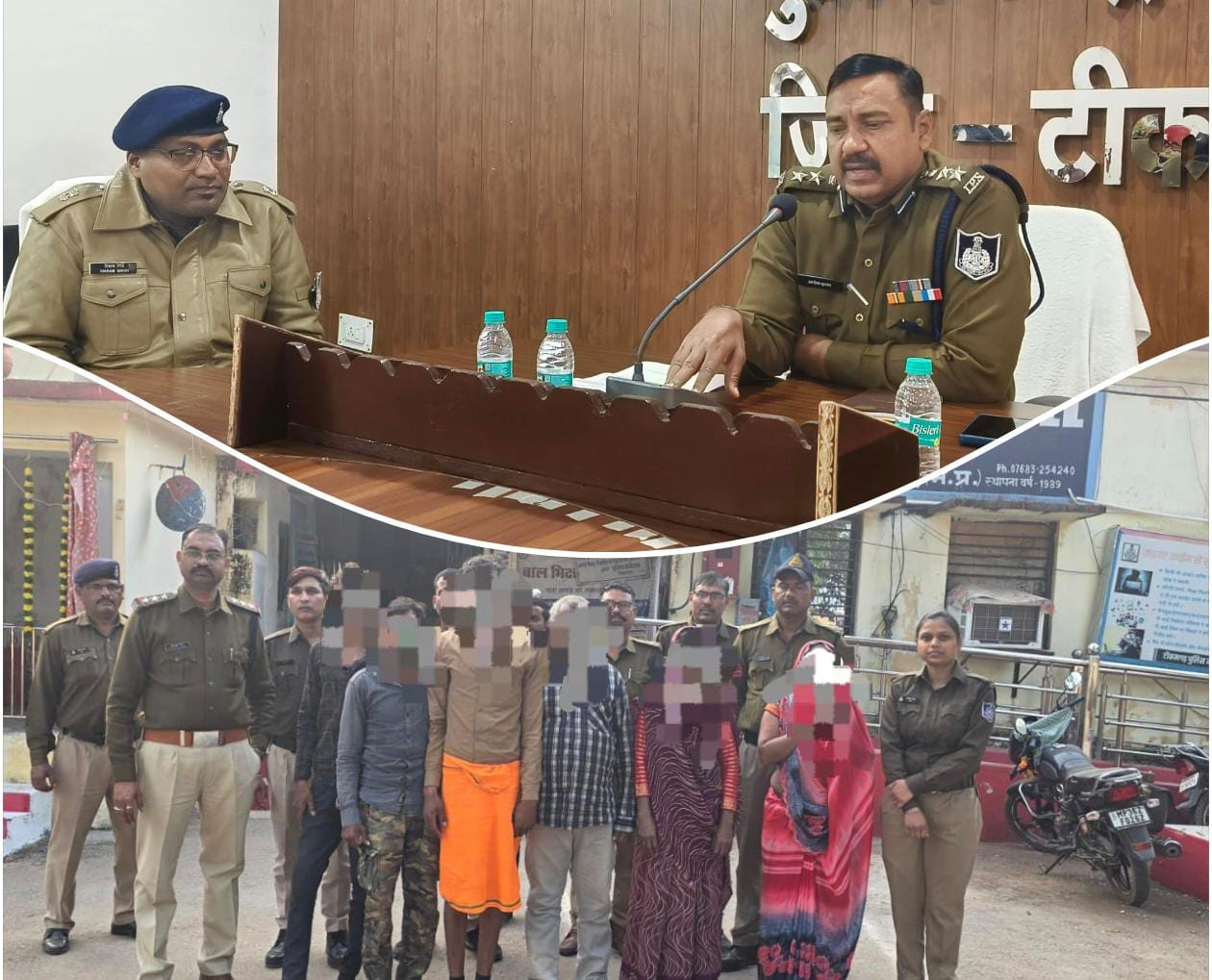 टीकमगढ़ । दिनांक 30.11.2025 को थाना जतारा में सूचना प्राप्त हुई की थाना जतारा अंतर्गत ग्राम राजनगर में दो पक्षों में भूमि विवाद को लेकर झगड़ा हो गया है। उक्त सूचना पर तत्काल घटना स्थल पर पुलिस पुहुंची जहां पर कई व्यक्ति घायल अवस्था में मिले जिन्हे घायलो को पुलिस द्वारा तुरंत ईलाज हेतु अस्पताल पुहुंचाया गया।एवं घटना की जानकारी ली गई जहां फरियादि करन राजपूत पुत्र चतुर्भुज राजपूत उम्र 17 वर्ष निवासी ग्राम सिमरा थाना वम्हौरीकलां ने बताय कि रामनगर में हमारे परिवार के लोग खेत पर पानी लगा रहे थे तभी हमारे गांव के चतुर राजपूत एवं पहलवान राजपूत जिनसे इस जमीन को लेकर हमारे परिवार का पुराना विवाद चल रहा है अपने परिवार वालों के साथ आकर हमारे परिवार वालो को गालियां देकर लाठी ,कुल्हाड़ी ,डंण्डो से मारपीट कर कहने लेगे ये खेत हमारा यहां से भाग जाओ। उक्त मारपीट से बलराम राजपूत पिता राजधर राजपूत उम्र 44 साल, परमलाल पिता राजधर राजपूत उम्र 37 साल , चतुर्भुज पिता राजधर राजपूत उर्म 35 सभी निवासी ग्राम सिमरा थाना बम्होरीकला जिला टीकमगढ़ की मृत्यु हो गई एवं इन्ही के परिवार के चार लोग घायल हो गये जिनका इलाज चल रहा है। उक्त घटना के संवंध में में थाना जतारा में अपराध 258/25 धारा 103 (1), 109 (1), 115(2), 296 (ए),191 (3),190,118 (1), वीएनएस का कायम किया जाकर विवेचना में लिया गया। पुलिस उप महानिरीक्षक छतरपुर रेंज विजय खत्री एवं पुलिस अधीक्षक आलोक कुमार द्वारा स्वयं घटना स्थल पर पहुँचकर फरियादी पक्ष से मिले ,घटना स्थल का बारीकी से परीक्षण किया गया एवं आरोपियों की गिरफ्तारी हेतु एएसपी श्री विक्रम सिंह कुशवाहा,एसडीओपी जतारा श्री अभिषेक गौतम के नेतृत्व में 04 पुलिस टीमें गठित की गई जिन्हें आरोपियों की गिरफ्तारी हेतु आवश्यक दिशा निर्देश दिए गए । पुलिस अधीक्षक की मॉनिटरिंग में गठित पुलिस टीमों द्वारा घटना के सभी सात नामजद आरोपियों को मुखबिर तंत्र एवं साइबर सेल की मदद से गिरफ्तार किया गया एवं एक विधि विरुद्ध बालक को अभिरक्षा में लिया गया । गिरफ्तार आरोपियों मे चतुर पिता ठाकुरदास राजपूत, पहलवान उर्फ कुलदीपक पिता ठाकुरदास राजपूत, भूपसिंह उर्फ कल्लू पिता चतुर राजपूत, लल्लू पिता चतुर राजपूत, श्रीमति रीना राजपूत पति पहलवान उर्फ कुलदीप राजपूत, श्रीमति रानी राजपूत पति चतुर राजपूत जो की सभी निवासी ग्राम सिमरा के हैं। वहीं इसी मामले में एक विधि विरुद्ध बालक को भी पुलिस ने अभिरक्षा में लिया है। आरोपियों से पुलिस ने घटना में प्रयुक्त लाठी, डंडे, कुल्हाड़ी आदि भी जप्त किए हैं जहां इस घटना का कारण जमीनी विवाद है जहां मामला न्यायालय में लंबित था। इस मामले के संपूर्ण खुलासा में एसडीओपी अभिषेक गौतम, निरी. रविभूषण पाठक थाना प्रभारी जतारा, निरी. संदीप चौधरी थ