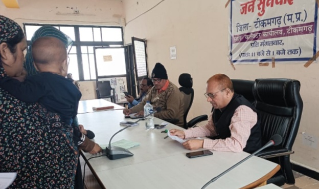 टीकमगढ़। शासन के निर्देशानुसार मंगलवार 02 दिसंबर 2025 को जिला मुख्यालय पर संयुक्त कार्यालय परिसर में जनसुनवाई आयोजित की गई। संयुक्त कार्यालय परिसर स्थित जनसुनवाई कक्ष में संयुक्त कलेक्टर श्री शैलेन्द्र सिंह तथा डिप्टी कलेक्टर श्री एसके तोमर ने आमजन से प्राप्त शिकायतों एवं समस्याओं को सुना तथा निराकरण हेतु संबंधित विभागों के अधिकारियों को निर्देशित किया। उन्होंने प्राप्त आवेदनों पर संबंधित विभागों के अधिकारियों को त्वरित कार्यवाही करते हुए शीघ्र निराकरण करने के निर्देश दिए। इस दौरान संबंधित अधिकारी उपस्थित रहे। जनसुनवाई में आमजन से प्राप्त 78 आवेदनों पर सुनवाई की गई। आवेदन पत्रों को 10 दिवस में निराकृत कर उसका प्रतिवेदन प्रस्तुत करने के निर्देश दिये गये। जनसुनवाई में आमजनता से प्राप्त पेंशन, उपचार सहायता, खाद्यान्न पर्ची प्राप्त नहीं होने, गरीबी रेखा में नाम शामिल करने, सीमांकन, विधवा तथा दिव्यांग पेंशन, राहत राशि के वितरण तथा जाति प्रमाण पत्र सहित विभिन्न आवेदन पत्रों पर सुनवाई की गई।