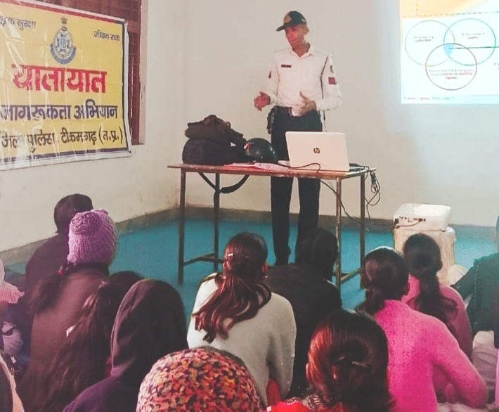 टीकमगढ़ । पुलिस मुख्यालय भोपाल के निर्देशानुसार राष्ट्रीय सड़क सुरक्षा माह 2026 का आयोजन प्रदेशभर में दिनांक 01 जनवरी 2026 से 31 जनवरी 2026 तक किया जा रहा है। इस वर्ष की थीम सड़क सुरक्षा जीवन रक्षा निर्धारित की गई है, जिसका उद्देश्य सड़क दुर्घटनाओं में कमी लाना एवं जन-जीवन की सुरक्षा सुनिश्चित करना है। इसी क्रम में पुलिस अधीक्षक मनोहर सिंह मंडलोई के मार्गदर्शन में जिले के समस्त थाना प्रभारियों को निर्देशित किया गया है कि सड़क सुरक्षा माह के अंतर्गत स्कूलों, महाविद्यालयों एवं सार्वजनिक स्थलों पर व्यापक स्तर पर जागरूकता कार्यक्रम आयोजित कर आमजन को यातायात नियमों के प्रति सजग किया जाए। दिनांक 06 जनवरी 2026 को अतिरिक्त पुलिस अधीक्षक विक्रम सिंह कुशवाह* एवं एसडीओपी टीकमगढ़,जतारा के मार्गदर्शन में जिले के विभिन्न थाना क्षेत्रों एवं यातायात थाना द्वारा सड़क सुरक्षा से संबंधित जागरूकता कार्यक्रम आयोजित किए गए। इन कार्यक्रमों के माध्यम से नागरिकों को यातायात नियमों के पालन हेतु प्रेरित किया गया तथा सड़क दुर्घटना में घायल व्यक्तियों की सहायता हेतु राज्य शासन द्वारा संचालित राहवीर योजना की विस्तृत जानकारी प्रदान की गई। थाना यातायात द्वारा नगर के शासकीय हाई स्कूल शिशु मंदिर में सड़क सुरक्षा जागरूकता कार्यक्रम आयोजित किया गया। कार्यक्रम के दौरान छात्र-छात्राओं को यातायात नियमों, सड़क सुरक्षा निर्देशों, गोल्डन ऑवर के महत्व, राहवीर योजना, सड़क संकेतों की जानकारी प्रेजेंटेशन के माध्यम से दी गई। साथ ही जागरूकता पंपलेट्स का वितरण किया गया। कार्यक्रम में लगभग 165 विद्यार्थियों शिक्षकगण एवं विद्यालय स्टाफ को सड़क सुरक्षा के प्रति जागरूक किया गया। विद्यार्थियों से अपील की गई कि वे स्वयं यातायात नियमों का पालन करें एवं अपने परिवार एवं आसपास के लोगों को भी इसके लिए प्रेरित करें। जिले के थाना *बड़ागांव, लिधोरा एवं कुड़ीला द्वारा सार्वजनिक स्थलों पर ट्रैफिक चौपाल आयोजित कर आमजन को राष्ट्रीय सड़क सुरक्षा माह की जानकारी दी गई। इस दौरान हेलमेट एवं सीट बेल्ट के अनिवार्य उपयोग, सुरक्षित वाहन संचालन एवं यातायात नियमों के पालन के महत्व को रेखांकित किया गया। साथ ही राहवीर योजना के अंतर्गत दुर्घटना में घायल की सहायता करने पर मिलने वाले प्रोत्साहन की जानकारी देकर नागरिकों को मानवता के इस दायित्व हेतु प्रेरित किया गया। इसी क्रम में थाना लिधोरा द्वारा यातायात नियमों का पालन करने वाले वाहन चालकों को फूल भेंट कर सम्मानित किया गया, जिससे अन्य नागरिकों को भी नियमों के पालन हेतु प्रेरणा प्राप्त हो सके। पुलिस द्वारा राष्ट्रीय सड़क सुरक्षा माह के अंतर्गत जिले भर में निरंतर जागरूकता कार्यक्रम, 