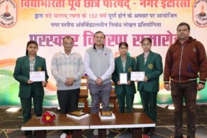 राष्ट्रगीत वन्देमातरम के 150 वर्ष पूर्ण होने पर विद्याभारती पूर्व छात्र परिषद द्वारा निबंध प्रतियोगिता का आयोजन किया गया! जिसमे शहर के 30 विद्यालयों के विद्यार्थियों ने भाग लिया! जिसके पुरुस्कार वितरण समारोह साईं कृष्णा रिसोर्ट इटारसी में आयोजित किया गया! जिसमे शिक्षा विभाग संयुक्त संचालक मनीष वर्मा जी और विशिष्ट अतिथि कॉल पंकज अग्रवाल के द्वारा विद्यार्थियों को पुरुस्कृत किया गया! इसमें वर्धमान पब्लिक स्कूल के 25 प्रतिभागियों ने सहभागिता दी जिसमे अनुष्का कुमारी (11th) ने प्रथम स्थान, जसप्रीत कौर (9th) ने द्वितीय स्थान तथा अंतरा वागरे (11th) ने तृतीय स्थान प्राप्त किया! विद्यालय प्रबंधन ने पुरुस्कृत सभी विद्यार्थियों को उनकी सफलता पर शुभकामनायें प्रेषित की!