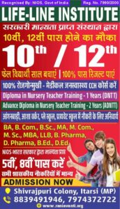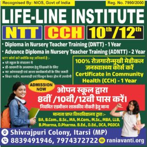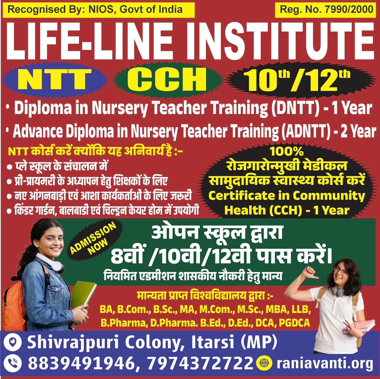 इटारसी: विगत 27 वर्षों से एजुकेशनल व्यावसायिक पाठ्यक्रम कराने हेतु समर्पित लाइफ-लाइन इंस्टीट्यूट द्वारा विभिन्न पाठ्यक्रमों को संचालित किया जा रहा है संस्था के द्वारा हजारों विद्यार्थियों को लाभ प्राप्त हो चुका है। इसी क्रम में आंगनवाड़ी, आशा कार्यकर्ता, बालवाड़ी, किंडरगार्डन हेतु एक अनिवार्य नर्सरी टीचर्स ट्रेनिंग डिप्लोमा (DNTT) कराया जा रहा हैं। साथ ही यह कोर्स आपके स्वयं के प्ले स्कूल संचालन में आवश्यक रहेगा। अब आपके शहर इटारसी में ही इस पाठ्यक्रम को पूर्ण कर आप आसानी से रोजगार प्राप्त कर सकते हैं। साथी पीड़ित मानवता के हित में स्किल हेल्थ वर्कर के रूप में कार्य करने हेतु 100% रोजगारोन्मुखी सामुदायिक स्वास्थ्य कोर्स ( CCH) भी आप कर सकते हैं । भारत सरकार द्वारा मान्यता प्राप्त बोर्ड द्वारा 10वीं, 12वीं पास करके विद्यार्थी अपना साल बचाएं। इनकी मान्यता नियमित एडमिशन एवं शासकीय नौकरी हेतु मान्य होती हैं। साथ हीं मान्यता प्राप्त विश्वविद्यालय द्वारा BA, B com, B Sc, MA, M Com, M Sc, MBA, B Pharma, D Pharma, LLB, BA LLB, DCA, PGDCA, B Lib, MLib, Phd करें। ओपन स्कूल की परीक्षा ऑनलाइन मोड में अप्रैल 2026 में होगी परीक्षा परिणाम (Result) मे पास की पूरी संभावना। पढ़ाई छोड़ चुके ड्राप आउट विद्यार्थी 8वीं पास करके साक्षर बने। संपर्क: लाइफ-लाइन इंस्टीट्यूट, रानी अवंती हेल्पलाइन, शिवराजपुरी कॉलोनी, पुरानी इटारसी, जिला नर्मदापुरम, मध्य प्रदेश