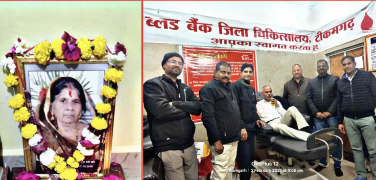 टीकमगढ़। अखिल भारतीय कायस्थ महासभा के प्रदेश सचिव कार्तिक खरे द्वारा अपनी माताजी स्वर्गीय श्रीमती सुधा देवी खरे, सेवानिवृत्त शिक्षिका, की 9वीं पुण्यतिथि के अवसर पर दिनांक 2 फरवरी 2026 को इस वर्ष भी रक्तदान कर मानवीय सेवा का अनुकरणीय उदाहरण प्रस्तुत किया गया। विगत वर्षों की भांति इस वर्ष भी उन्होंने डॉ. राजेंद्र प्रसाद जिला चिकित्सालय, टीकमगढ़ के ब्लड बैंक में पहुंचकर रक्तदान किया, ताकि आवश्यकता पड़ने पर किसी जरूरतमंद मरीज का जीवन बचाया जा सके।