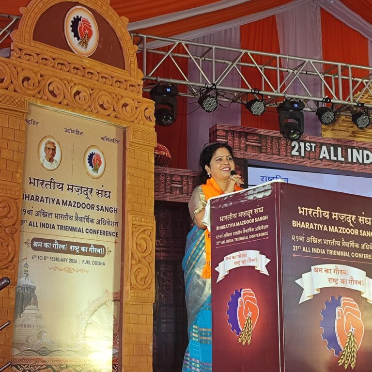नर्मदापुरम। विश्व के सबसे बड़े श्रमिक संगठन भारतीय मजदूर संघ (BMS) का 21वां त्रैवार्षिक अखिल भारतीय अधिवेशन 6 से 8 फरवरी 2026 तक ओडिशा के पुरी स्थित स्व. ओम प्रकाश अग्गी सभागार में भव्य रूप से आयोजित किया गया। तीन दिवसीय इस राष्ट्रीय अधिवेशन में देशभर से हजारों श्रमिक प्रतिनिधियों, 42 औद्योगिक महासंघों के प्रतिनिधियों तथा 12 अन्य देशों से आए अंतरराष्ट्रीय प्रतिनिधियों ने सहभागिता की।इस महत्वपूर्ण अधिवेशन में नर्मदापुरम की श्रीमती अनामिका वर्मा ने राष्ट्रीय राज्य कर्मचारी महासंघ की ओर से अखिल भारतीय कार्यसमिति सदस्य के रूप में प्रतिनिधित्व किया तथा जिले का गौरव बढ़ाया। उन्होंने विभिन्न सत्रों में श्रमिक अधिकारों, महिला श्रमिक सशक्तिकरण, सामाजिक सुरक्षा तथा बदलते औद्योगिक परिदृश्य में श्रमिक संगठनों की भूमिका से जुड़े विषयों पर आयोजित चर्चाओं में सक्रिय भागीदारी की।