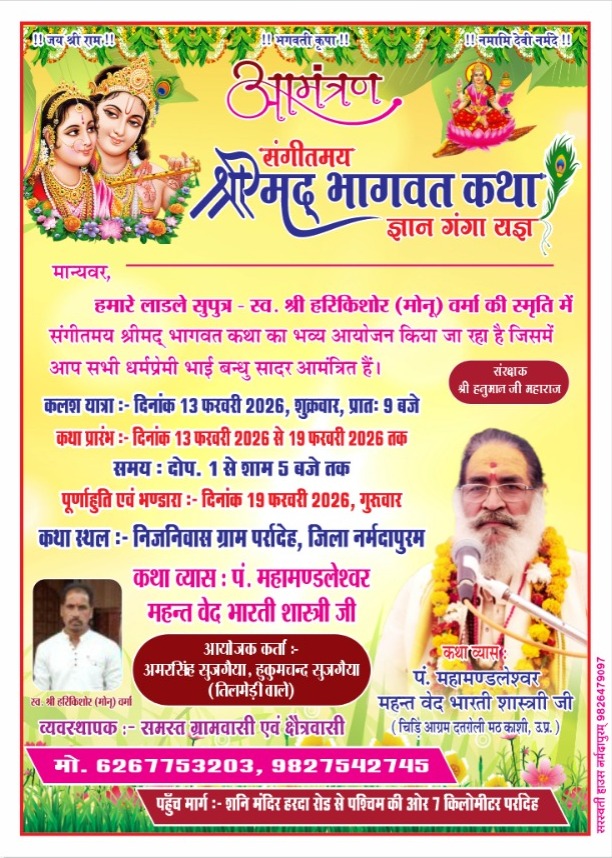 नर्मदापुरम /ग्राम पर्रादेह में संगीतमय में श्रीमद् भागवत कथा का शुभारंभ स्व श्री हरिकिशोर (मोनू वर्मा)की पूज्य स्मृति भव्य आयोजन होने जा रहा हैं कल सुबह 9 बजे से कलश यात्रा निकाली जावेगी