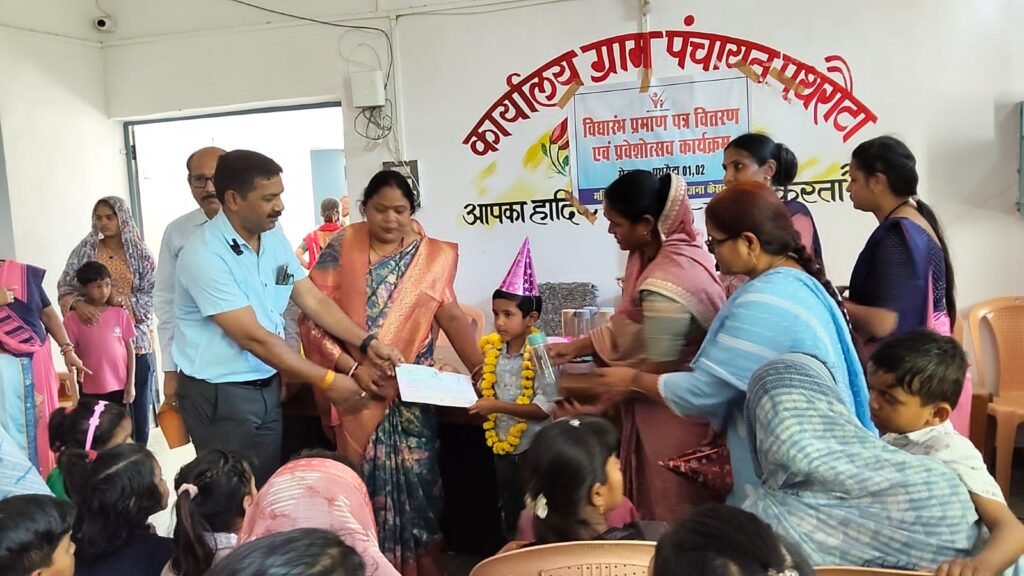 कि कोई भी बच्चा शिक्षा से वंचित न रहे और सभी पात्र बच्चों का समय पर विद्यालय में प्रवेश हो इसके साथ ही बच्चों में नियमित उपस्थिति ,सीखने के प्रति रुचि एवं अभिभावकों की सहभागिता बढ़ाने पर विशेष जोर दिया गया कार्यक्रम में उपस्थित जिला कार्यक्रम अधिकारी,परियोजना अधिकारी,पर्यवेक्षक सुश्री चेतना ढिवरे व कंचन सदेले द्वारा बच्चों को प्रमाण पत्र प्रदान कर उनका सम्मान एवं उत्साह वर्धन किया गया व विद्यालयीन शिक्षा के प्रति बच्चों एवं अभिभावकों को प्रेरित किया गया , प्रमाणपत्र कुल 28 बच्चों को प्रदान किये गये उक्त कार्यक्रम में जनपद सदस्य श्रीमती आशा उइके,सरपंच श्रीमति डाली भलावी ,जनपद सदस्य श्री योगीराज पटैल व आंगनबाड़ी केंद्रों के बच्चे व पालक उपस्थित रहे