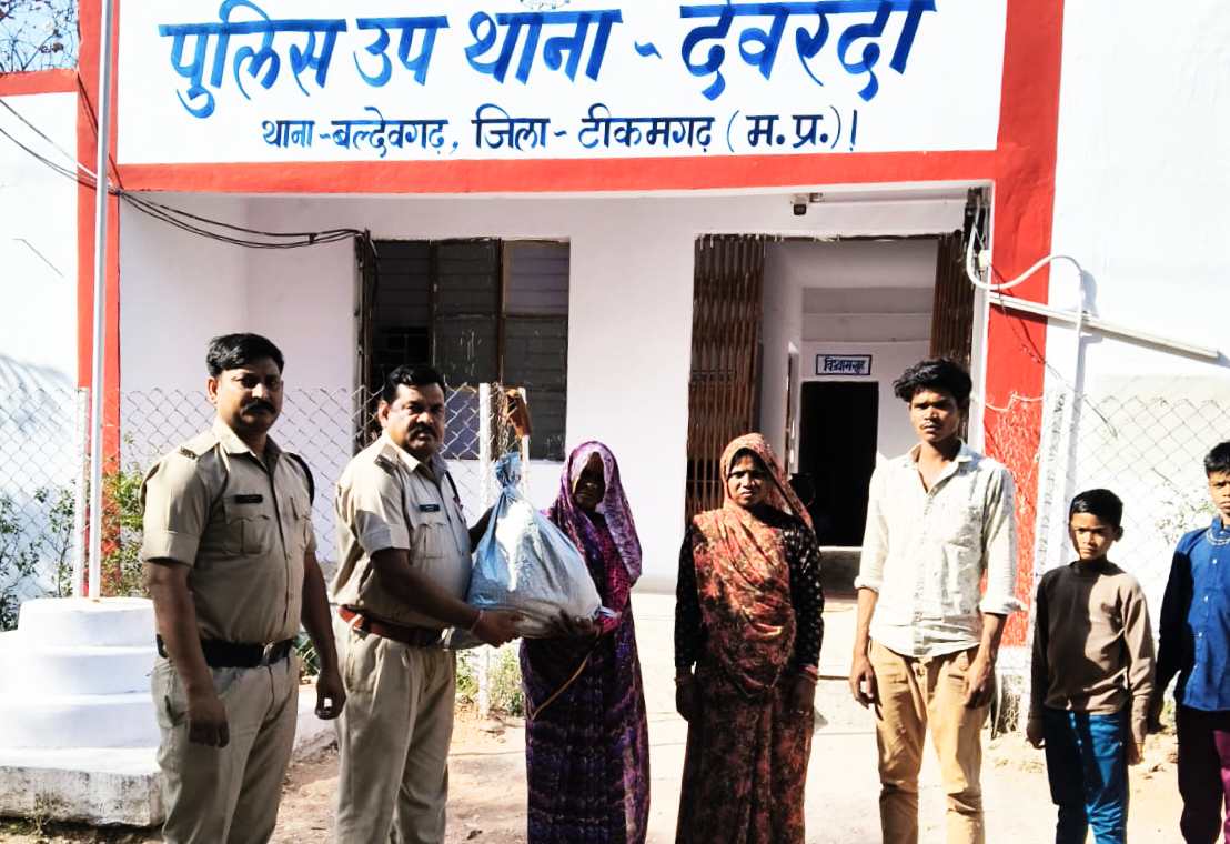 टीकमगढ़ । पुलिस अधीक्षक मनोहर सिंह मंडलोई के निर्देशन में जिले के सभी थाना प्रभारियों को यह स्पष्ट निर्देश दिए गए हैं कि वे अपने-अपने थाना क्षेत्रों में आमजन की आपातकालीन परिस्थितियों में संवेदन शीलता, तत्परता एवं मानवीय दृष्टिकोण के साथ सहायता सुनिश्चित करें। इसी क्रम में दिनांक 27 मार्च 2026 की रात्रि लगभग 09 बजे कन्नपुर, चौकी देवरदा निवासी प्रेमलाल आदिवासी के घर में अचानक शॉर्ट सर्किट के कारण आग लग गई। इस दुर्भाग्यपूर्ण घटना में परिवार की खाद्य सामग्री सहित आवश्यक सामान जलकर नष्ट हो गया, जिससे परिवार कठिन परिस्थिति में आ गया। घटना की जानकारी मिलते ही चौकी प्रभारी देवरदा सउनि लीलाधर सिंह एवं पुलिस टीम मौके पर पहुंची और तत्परता दिखाते हुए जनसहयोग से पीड़ित परिवार की मदद की। पुलिस द्वारा परिवार को राशन सामग्री उपलब्ध कराई गई, साथ ही बच्चों के लिए नमकीन एवं बिस्कुट देकर उनकी आवश्यक जरूरतों का ध्यान रखा गया।
